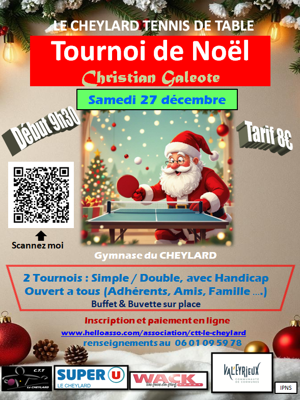 Notre tournoi de Noël "Christian Galeote" aura lieu le samedi 27 décembre 2025 au gymnase début du tournoi à 9h30.